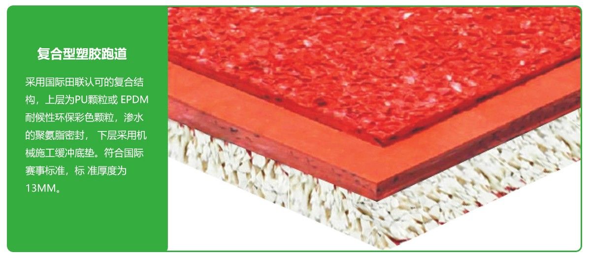 塑胶跑道面层材料主要为聚氨脂(PU)塑胶及三元乙丙(EPDM)橡胶,其优点具有:弹性优良,接着力强、耐磨、耐酸碱、抗老化,全天耐候性、环保、阻燃、防尘、无菌、无接缝、清洁、养护简单,颜色鲜艳、有利于美化环境及提高学生参与运动的兴趣。